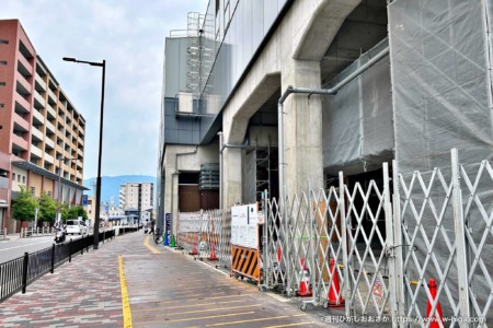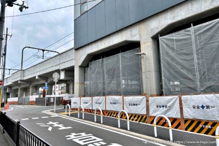 今回は駅前全体が大きく変化する河内花園駅前。現在南側の餃子の王将跡地や駐輪所跡地が取り壊され、UFJ跡地にはマンションが建設されています。今回は駅西側の高架下にも変化が。