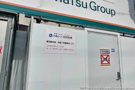 先日通ってみると、外壁に「大阪シティ信用金庫東花園支店 令和7年春頃オープン」の文字が。