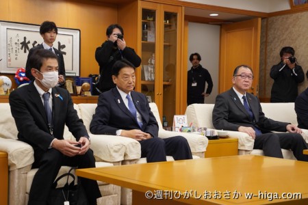 2023年12月19日、FC大阪の近藤祐輔代表取締役社長、舘野俊祐選手、坂本修佑選手が東大阪市の野田義和市長を表敬訪問。2023シーズンの終了を報告し、チームの新たな展望について意見交換が行われました。