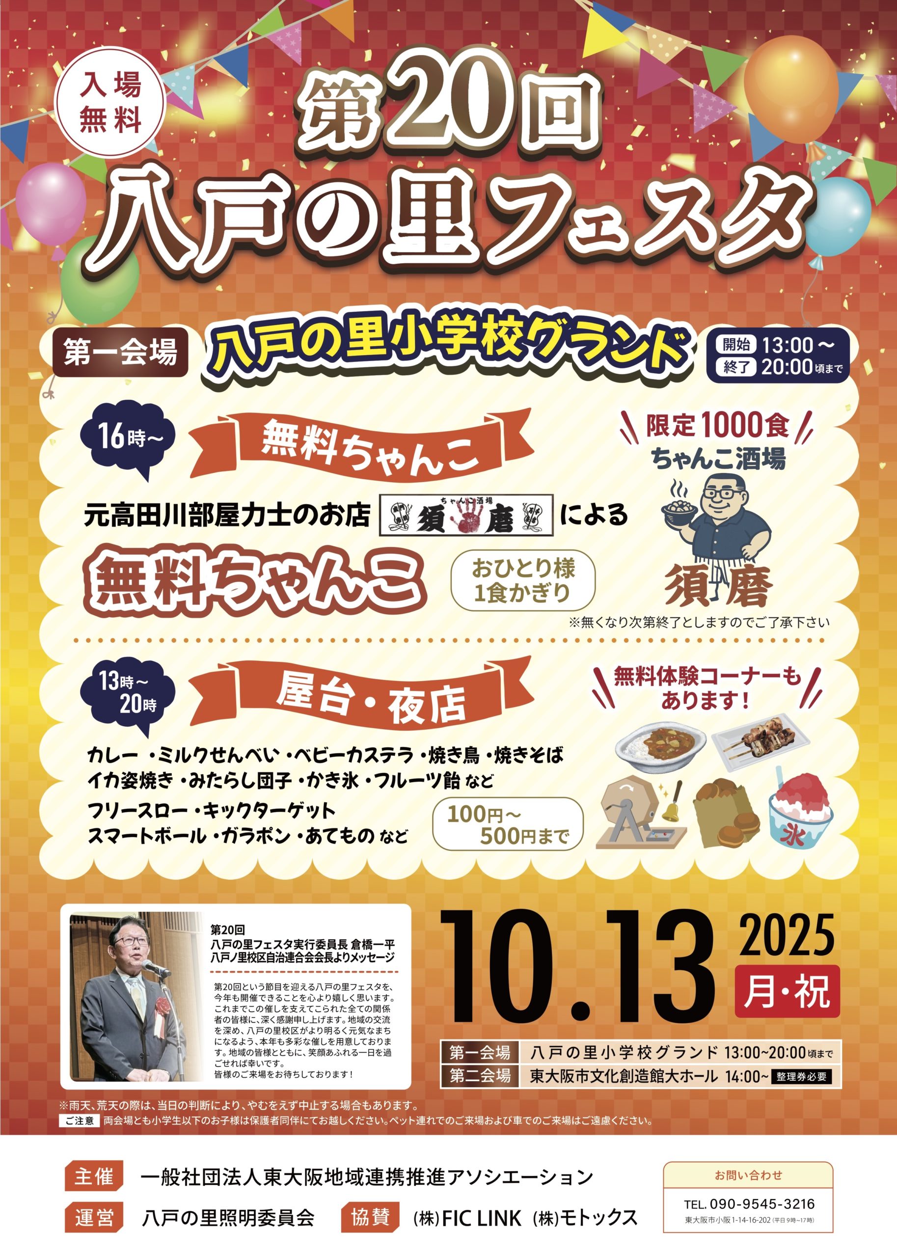 | 備考 | <第1会場:八戸の里小学校グラウンド> ■元高田川部屋力士のお店「ちゃんこ酒場 須磨」による無料ちゃんこ 開催時間:16:00〜 ※おひとり様1食限り ※限定1000食、無くなり次第終了 ■屋台・夜店(100円〜500円まで) <第2会場:東大阪市文化創造館大ホール> <ご注意> |