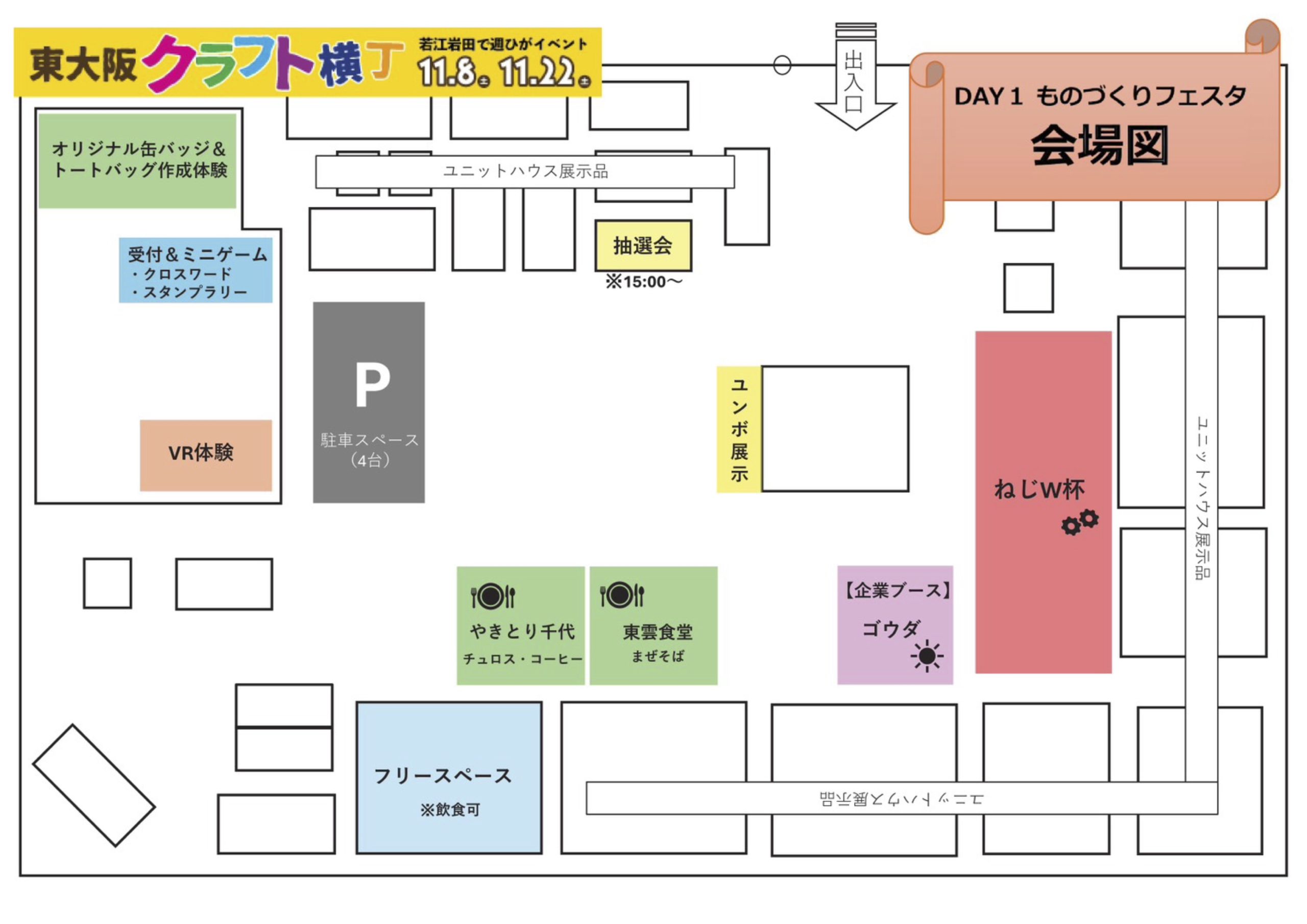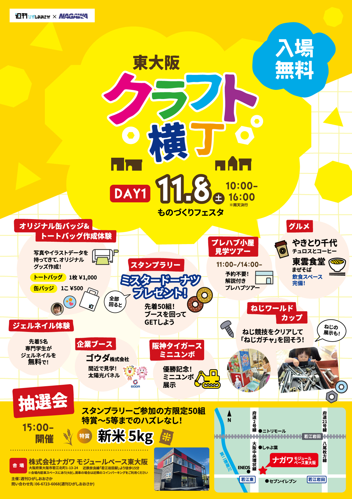 11/8(土)、府道2号線(大阪中央環状線)南行き若江東交差点の北東角にあるナガワモジュールベース東大阪にて、ものづくりフェスタ「東大阪クラフト横丁DAY1」を開催します。