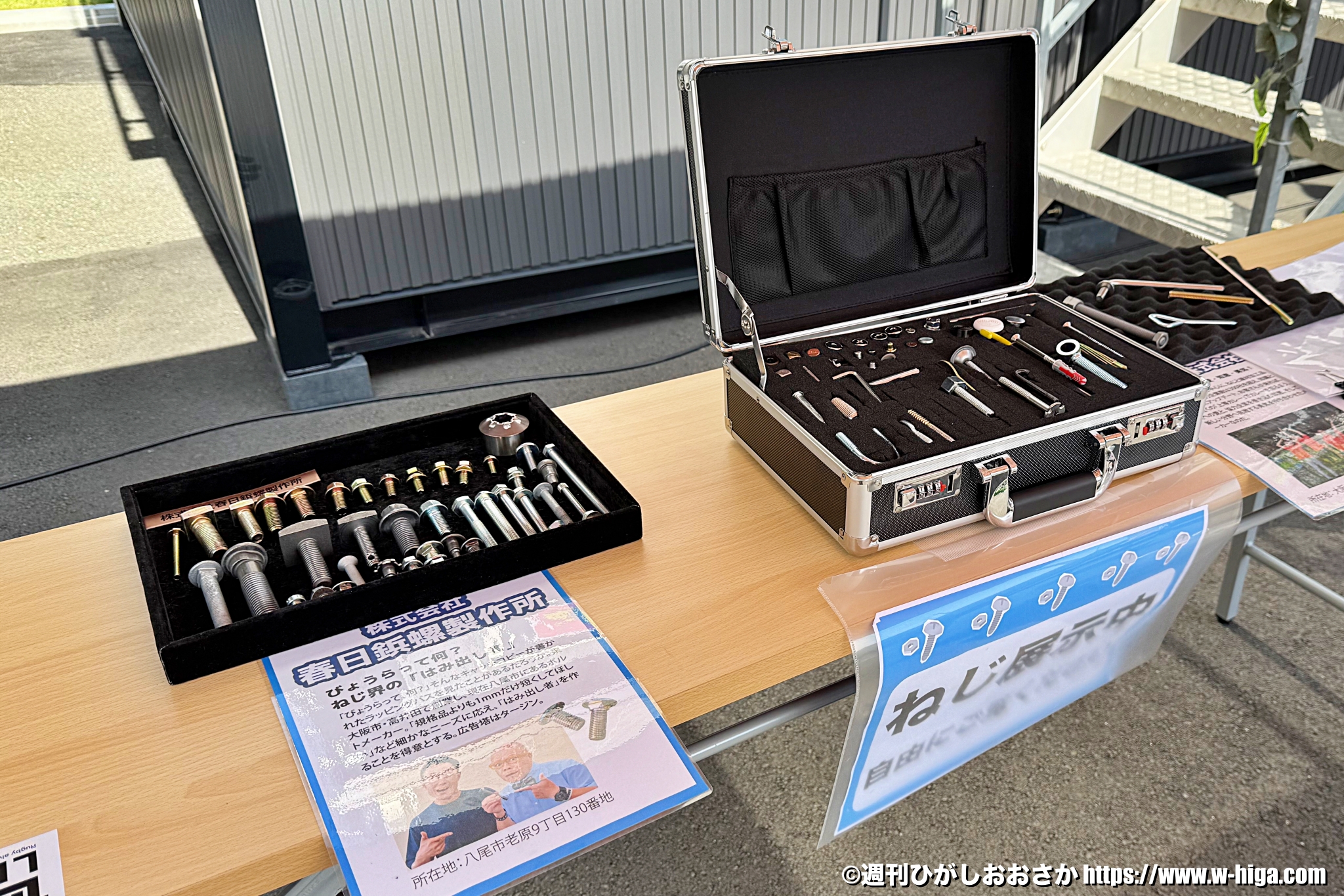 また、ものづくりの街東大阪らしく、ねじの展示も。若江南町のナットメーカー「紀州ファスナー」、宝町のボルトメーカー「西岡鋲螺」、長田西のボルトメーカー「金剛鋲螺」の3社のねじを展示します。