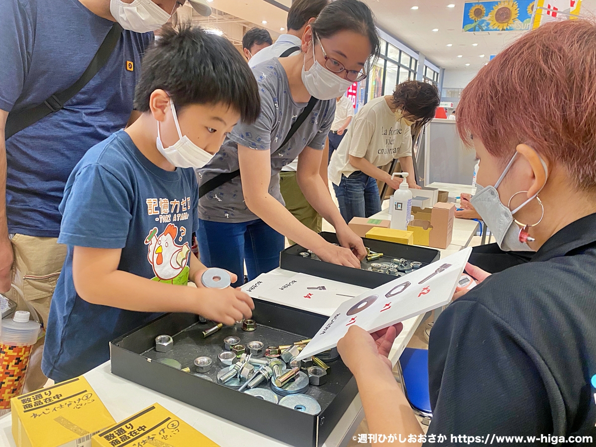 週刊ひがしおおさかのイベントといえばの「ねじワールドカップ」をはじめ、オリジナル缶バッジ&トートバッグ作成体験やプレハブ小屋見学ツアー、太陽光パネル「ゴウダ」の企業ブース、阪神タイガース柄のミニユンボの展示など、内容盛りだくさんです。