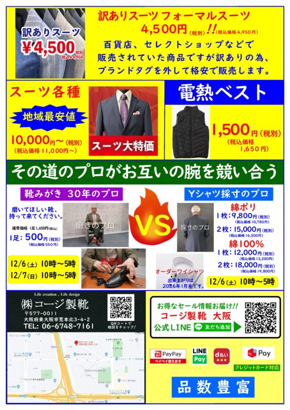 冬の気配が深まる12月。東大阪・荒本の街並みに、今年も「革靴の名工」コージ製靴の倉庫直売セールが帰ってきます。