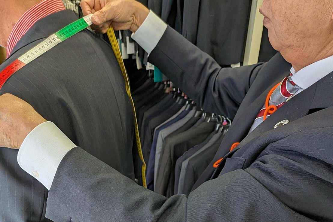 採寸は、長年培った経験がにじむ「職人の所作」。クセや姿勢を見抜き、その人にとって最適なラインを見つけていきます。