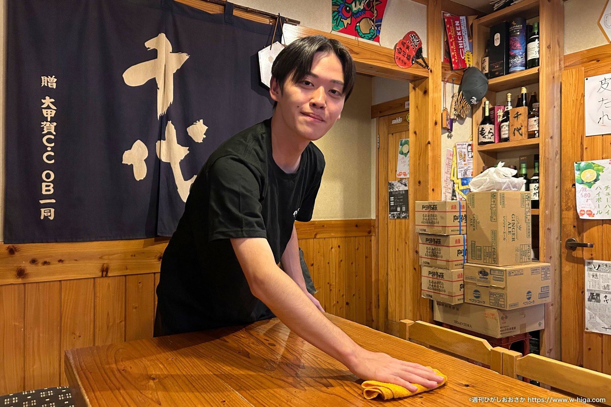 すっかり「やきとり千代」に興味津々の僕。なんと机拭きまで体験させてもらいました。