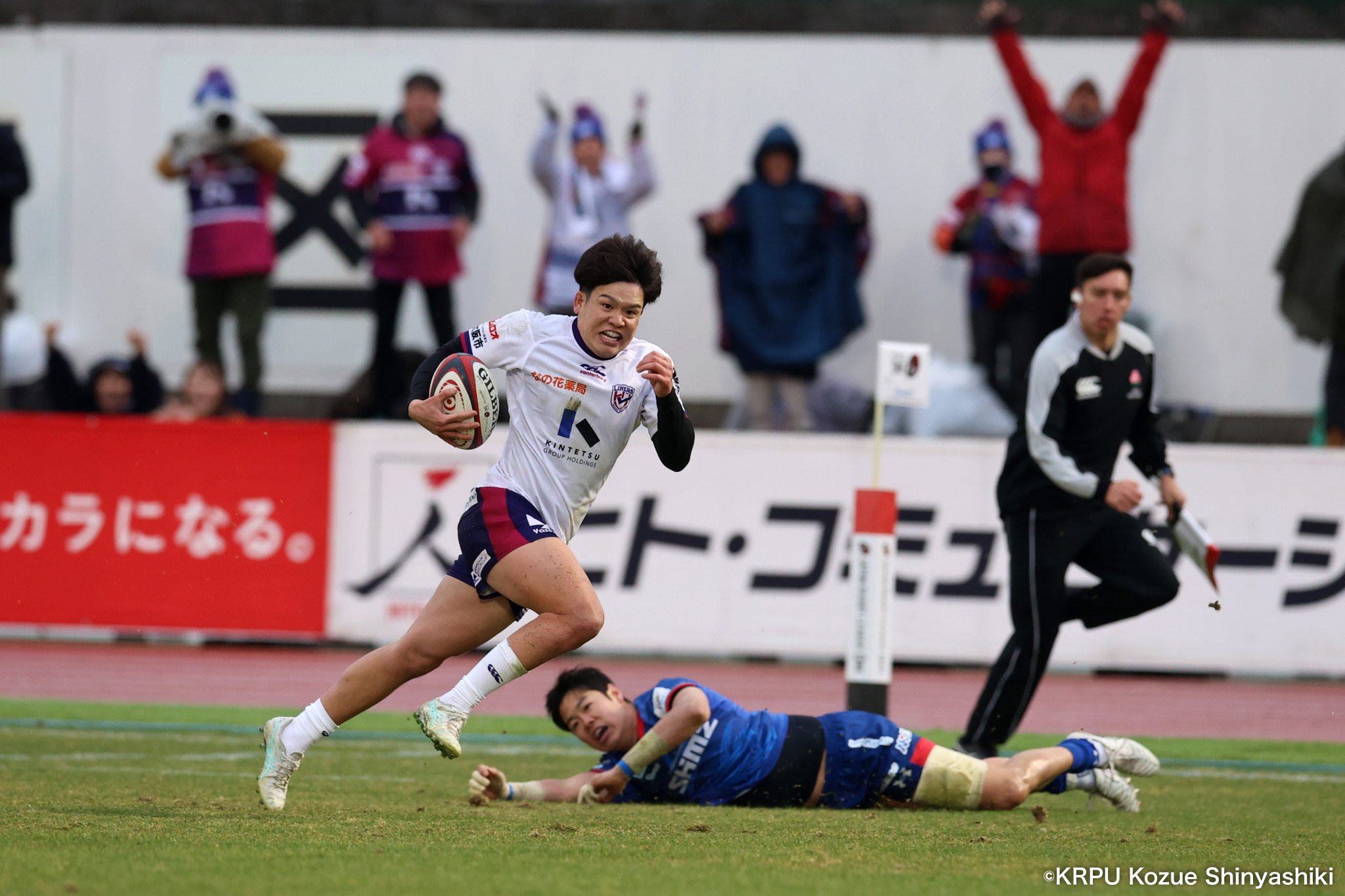 試合時間80分のうち、ライナーズは78分までリードを許していた。最後の最後のプレー、残り2分で夢の島は悲鳴に包まれた。キックパスが通るたびにホームのブルーシャークスファンから悲鳴が上がる。もちろん、21河村がトライラインの向こうに飛び込んだ際も。