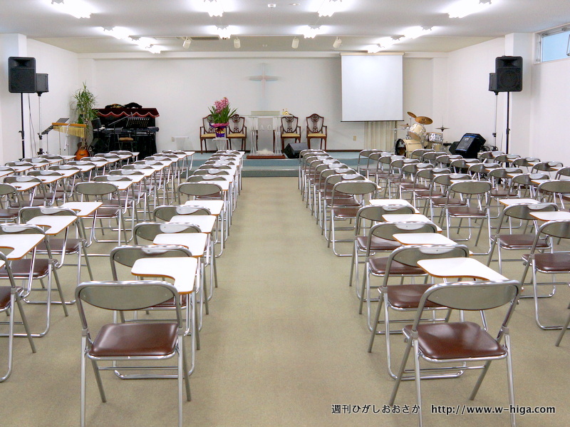教会内の礼拝堂へ一歩入ると、真っ白な壁に椅子がずら~り。ドラムやギター、キーボードなどが置かれ、思っていたよりも近代的な雰囲気です。
