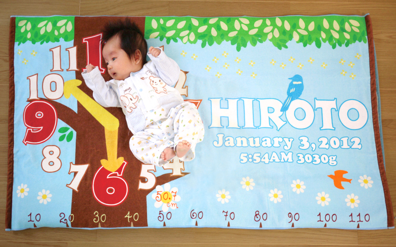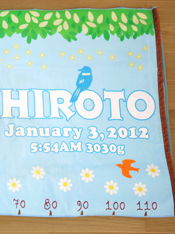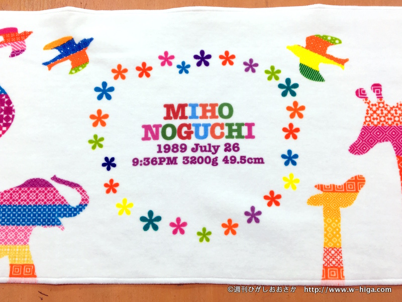 タオル、いいかも。むむ、よく見ると…名前に生年月日、体重、身長、生まれた時間まで描かれてる!