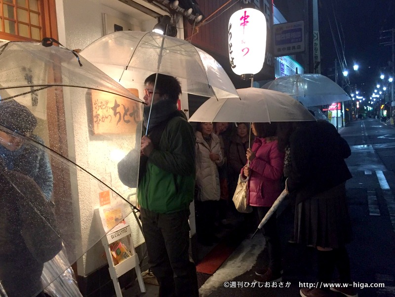 夕方から雨がポツポツと降り始め、19時を過ぎたころには本降りに。しかし、「串かつ ちとせ」や「鳥鳥(とっと)小阪店」、「あ・じゃぽん」などには行列ができ、勢いがとどまるはありませんでした。