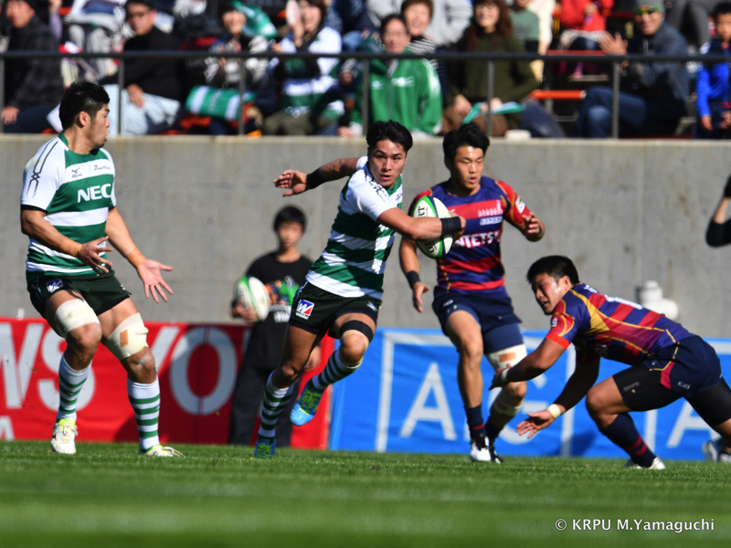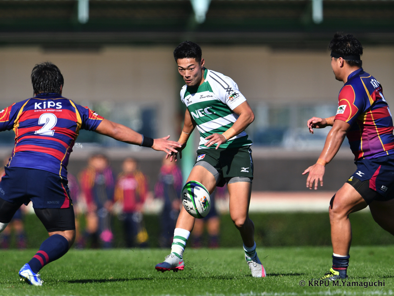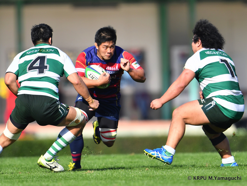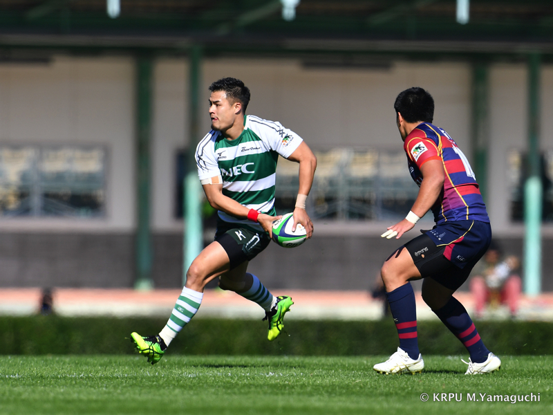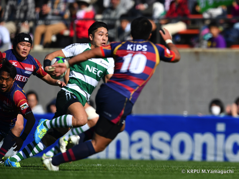 その後も淡白さが目立ります。ディフェンスで、間を抜けられるシーンが目立つのです。「やばいな…」と感じた18分。テンポ良く攻めるNECは22m内で13釜池が強いあたりでグイッとゲインすると、外の15吉廣が抜けて左へトライ。6-12とあっという間に「エライコッチャ」という状況になります。