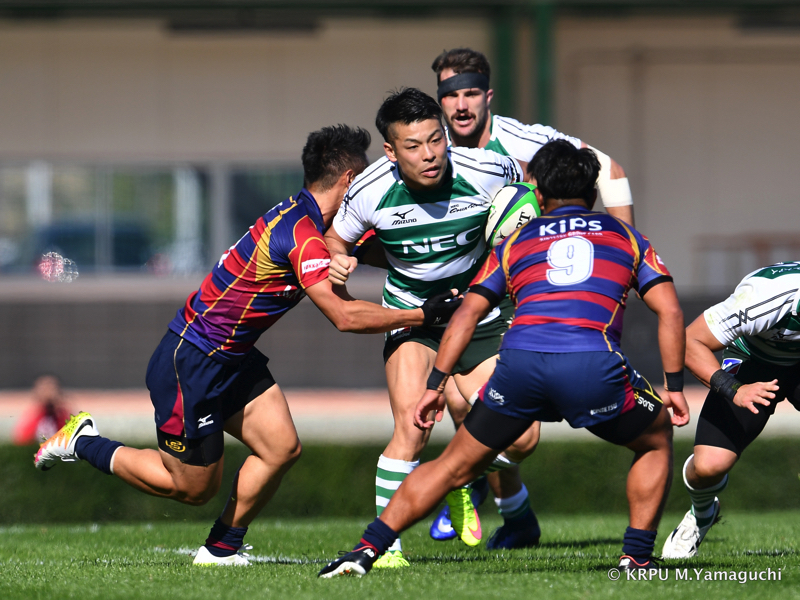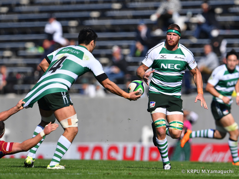 続けてNECは、ライナーズ陣内深くに攻め込むと、オフロードパスを2つつなげて、6ヒギンボッサムがど真ん中にトライ。Gも10田村が成功、6-19。