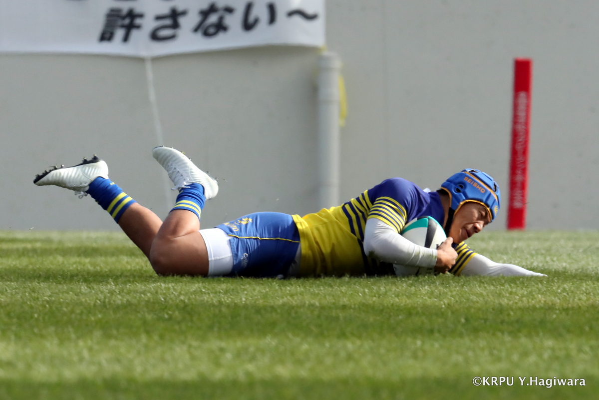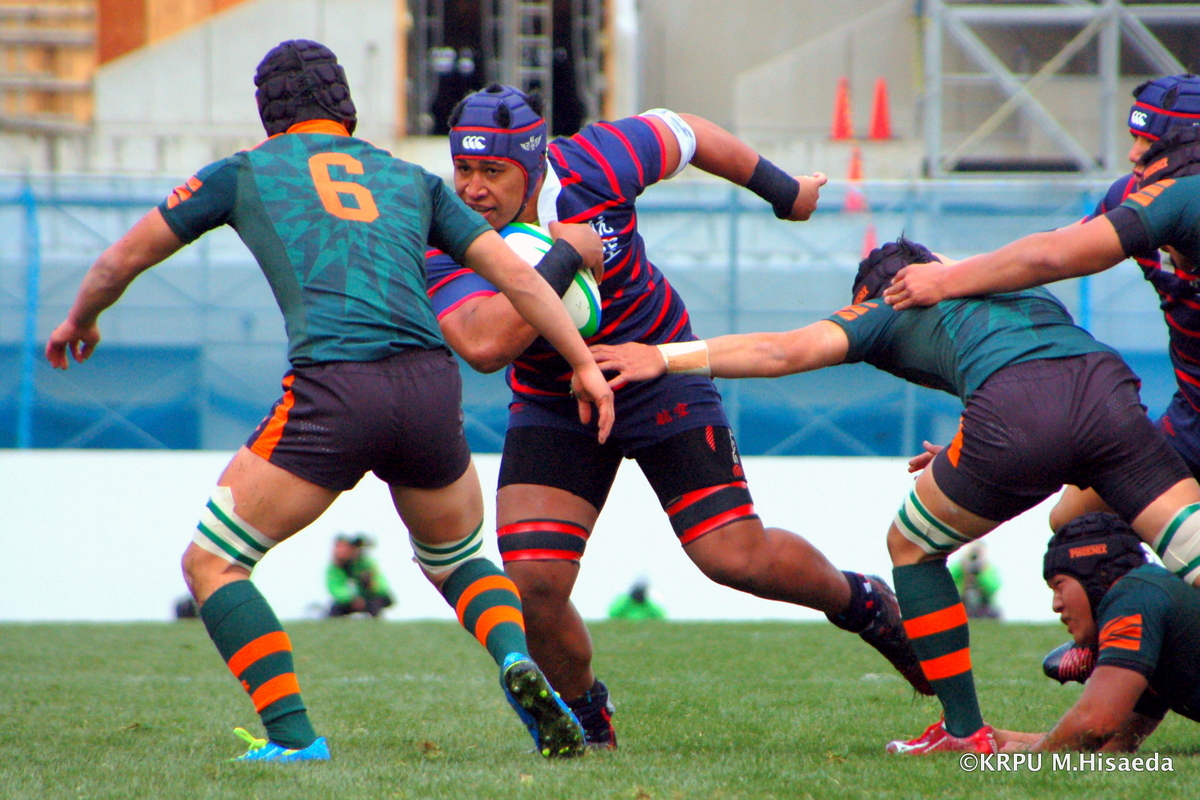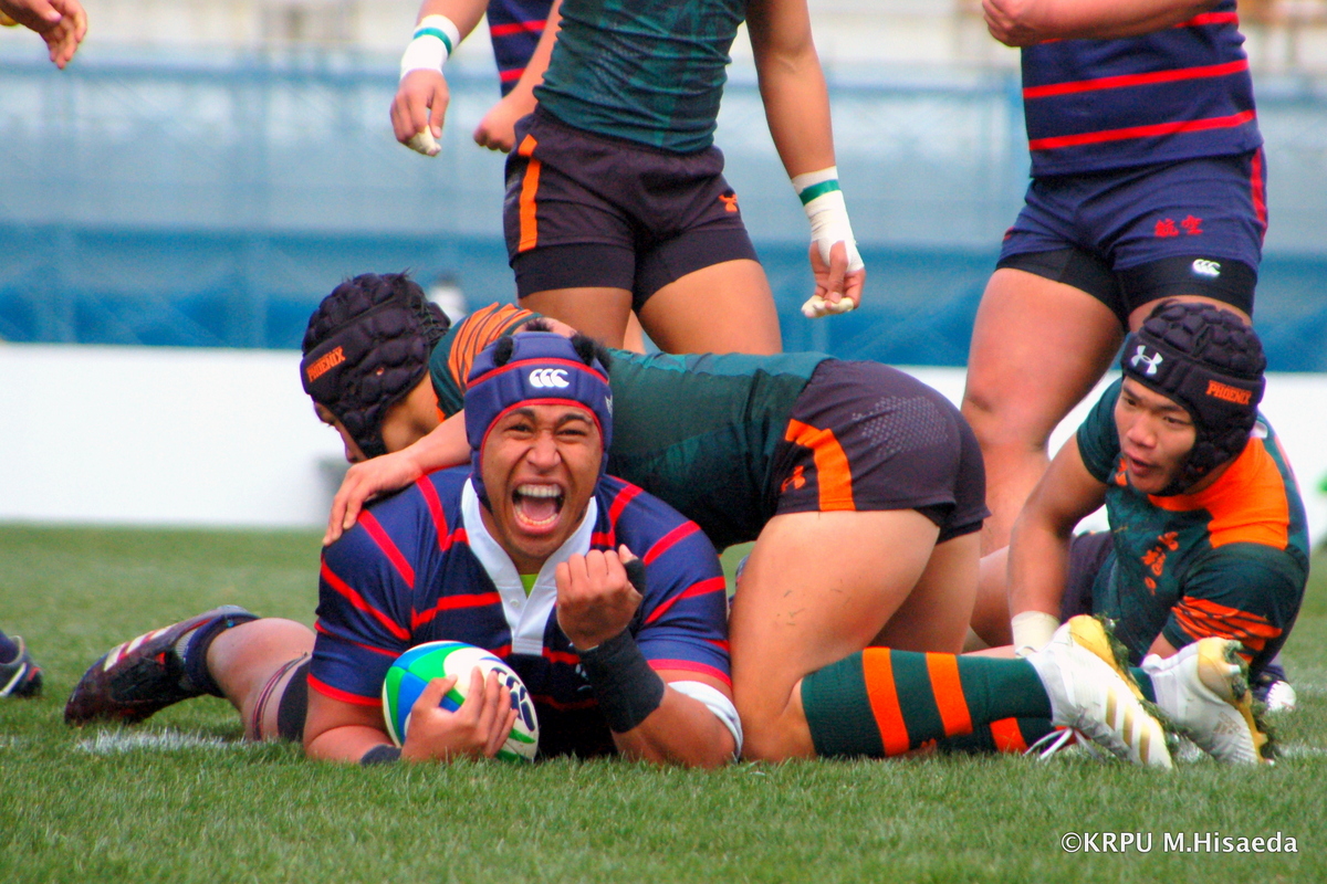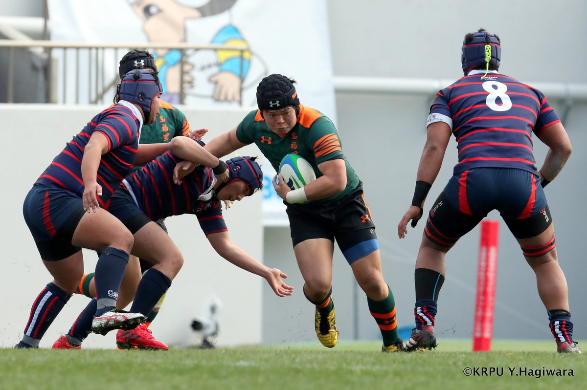 日本航空は序盤4ラウシ、8モアラの縦突進で優位を作り、1トライ。さらに勢いあるディフェンスで東福岡が自由に動く時間を奪う。