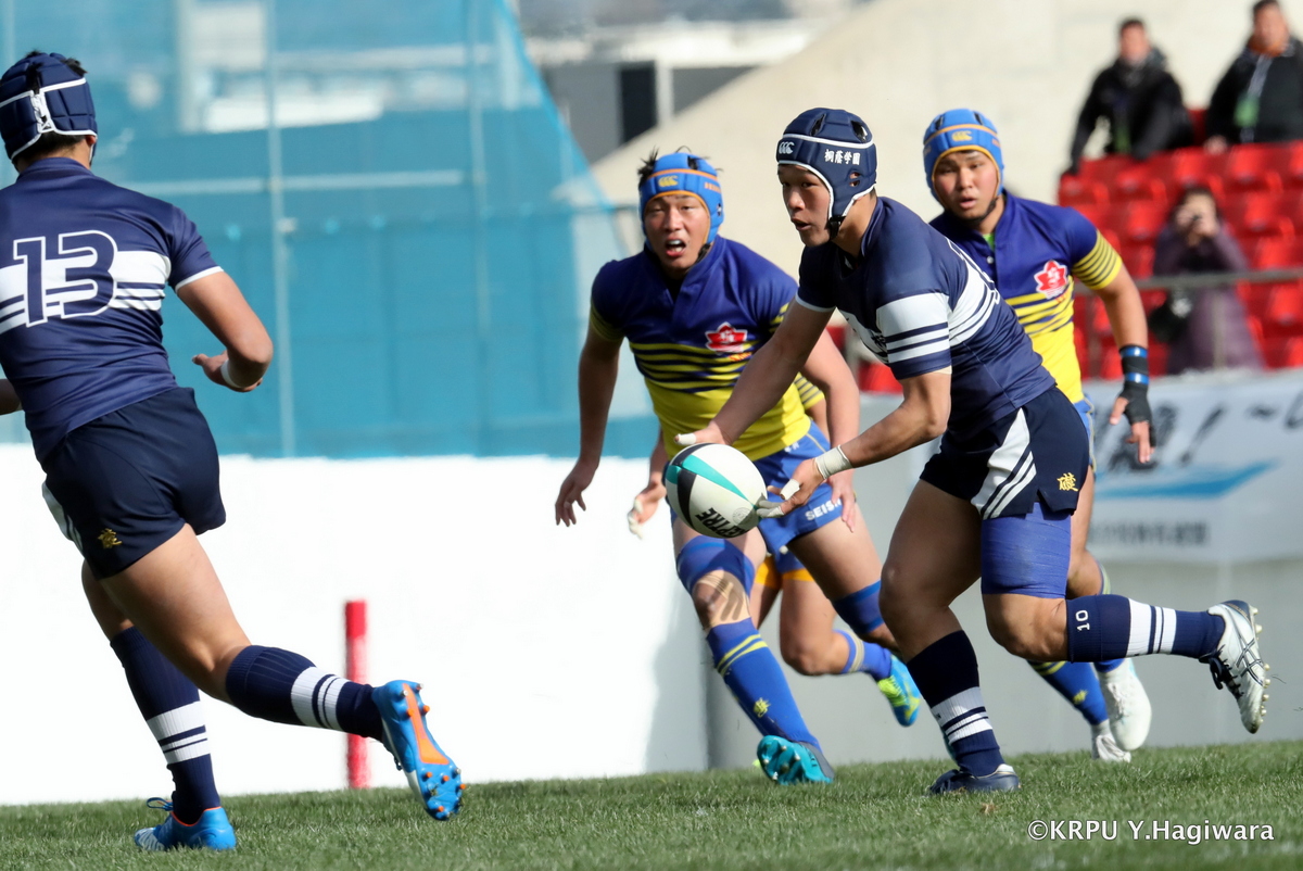 試合開始すぐに大阪桐蔭が敵陣カウンターラックからトライを奪うと、久我山も13分にラックからFWで奪い返す。力の拮抗した両チームだが、大阪桐蔭のフラットで長いパスの精度が勝り、4トライ。両チームともに質の高いFW・BK一体となったプレーでスタンドを沸かせた。