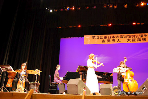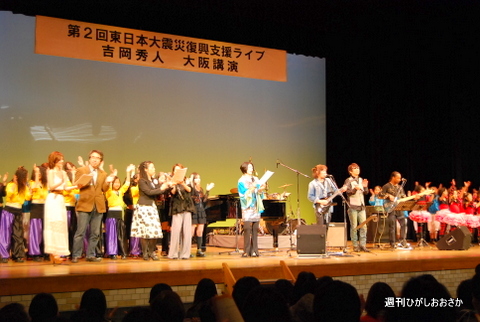 4月1日、東大阪市民会館市民ホールで「第2回東日本大震災復興支援ライブ吉岡秀人大阪講演 被災地宮城に子どもたちに医療を届けよう」と題するチャリティーライブが行われました。これは吉岡先生に感銘を受けた野中みやこさんが代表を務めるエンジェル布施チャリティークラブが主催したもの。