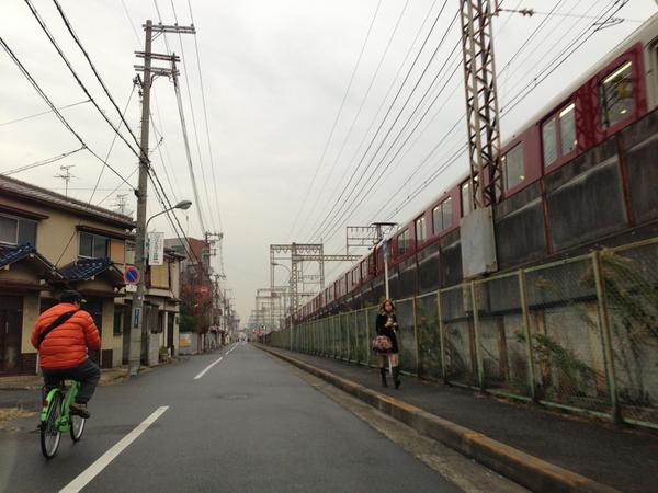東大阪市横沼町1丁目1付近。近鉄大阪線俊徳道駅から線路沿い東側を南に走りながら。右手に見えるのは、長瀬駅へ向かう普通電車。