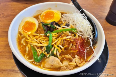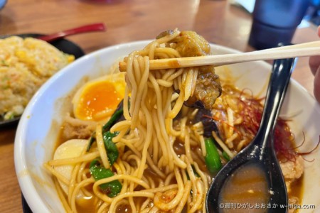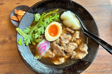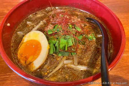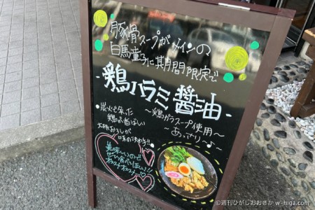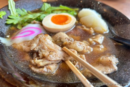 鶏肉あっさりスープ系の他店舗と違って、1店舗だけ濃い色のラーメンで勝負に出た!