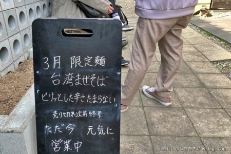 休日の営業は行列が絶えない同店で、12時を過ぎて訪問するとやはり待ちが。焦らされつつ、少し並んで3月限定「台湾まぜそば」にありつけました。