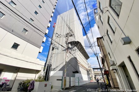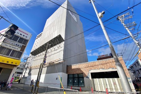 場所はJR河内永和駅と近鉄河内永和駅から北に徒歩1分ほど。2023年1月9日をもって閉店した「パチンコメトロ」の跡地です。メトロの解体工事が始まりマンションが建つとお知らせしたのが2023年6月。それから月日が経ちマンションの工事がだいぶ進みました。