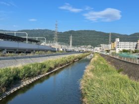 正解は、、、〒578-0931 大阪府東大阪市花園東町2-3付近、恩智川に架かる旧六ノ坪橋から東へ向かって撮影しました。背中側に新六ノ坪…