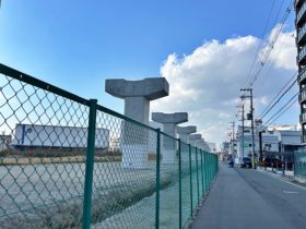 正解は、、、〒579-8066 大阪府東大阪市下六万寺町1-10付近を南に向かって、大阪外環状線を歩道橋から撮影しました。まっすぐ1k…