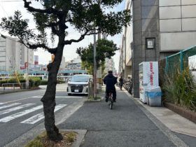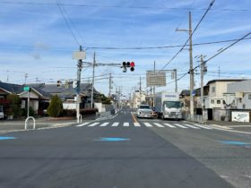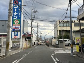 正解は、、、〒578-0984 大阪府東大阪市菱江4-8付近から南へ向かって撮影しました。南向きの一方通行で、国道308号線(中央大通り…