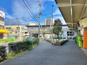 正解は、、〒577-0007 大阪府東大阪市稲田本町3-2付近、稲田商店街を南西に向かって撮影しました。右手の建物は「ヘルパーステー…