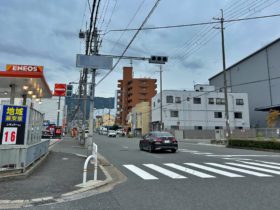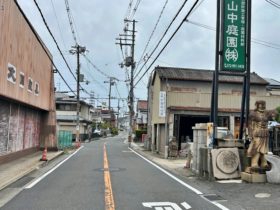 正解は、、、〒578-0984 大阪府東大阪市菱江2-18付近。大阪朝鮮中高級学校の北東角から北に向かって撮影しました。左折すれば、…