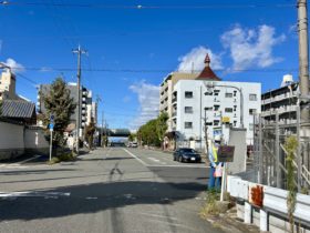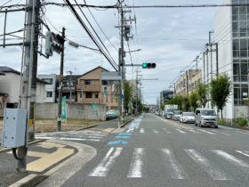 正解は、、、〒578-0955 大阪府東大阪市横枕南2付近。職業訓練校「東大阪高等職業技術専門校」を背に、中央大通りに向かって撮影し…