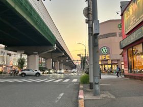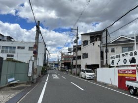 〒577-0016 大阪府東大阪市長田西1-2付近。東大阪市立楠根斎場の前から北西に向かって撮影しました。