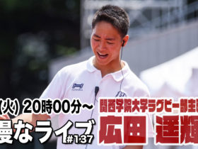 週ひががご機嫌にラグビー関係者と対談するYoutube企画「冗漫なライブ」。第137回は「関西大学リーグ主務さん登場回シリーズ」の第5回、関西学院大学ラグビー部主務・広田遥輝さんにご出演いただきます。
