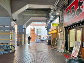 正解は、、、〒577-0801 大阪府東大阪市小阪2-1付近。近鉄八戸ノ里駅高架下、居酒屋「のんでこ」の前から南に向かって撮影しました…