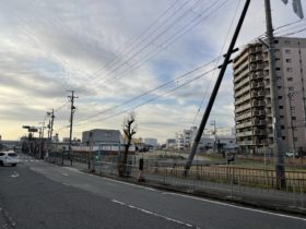 正解は、、、〒577-0011 大阪府東大阪市荒本北1付近を北西へ向かって撮影しました。正面の空き地は上空から見ると三角形になっている…
