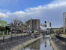 正解は、、、〒577-0063 大阪府東大阪市川俣1-2付近を南東に向かって撮影しました。正面は長瀬川遊歩公園、奥には阪神高速13号東大…