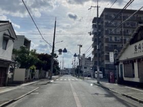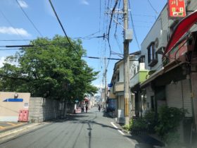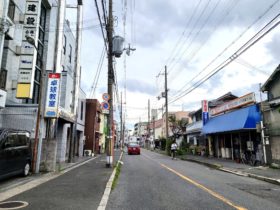 正解は、、、〒579-8011 大阪府東大阪市東石切町4付近を東に向かって撮影しました。後方は石切駅北口、真っ直ぐ進むと石切山手保育園…