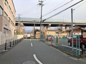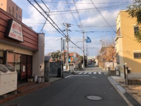 正解は、、、〒577-0807 大阪府東大阪市菱屋西1-19付近、古民家を改修したシェアハウス「ながせの長屋」を左手に、西に向かって撮…