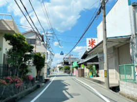 正解は、、、〒578-0915 大阪府東大阪市古箕輪1-9付近。樋口米穀店前から北向きの一方通行を、北に向かって撮影しました。古箕輪橋…