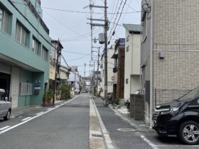 正解は、、、〒577-0055 大阪府東大阪市長栄寺14付近。南向き一方通行の道路を、南に向かって撮影しました。道なりに進むと高井田系…