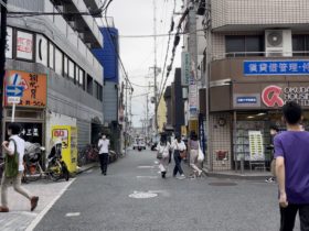 正解は、、、〒577-0818 大阪府東大阪市小若江1-1付近を北に向かって撮影しました。正面に見えている「旭通り商店街」の手前を東へ…