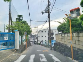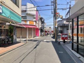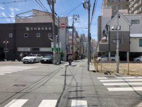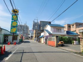 正解は、、、〒577-0057 大阪府東大阪市足代新町23付近、足代公園を右手に東に向かって撮影しました。写真左手はスーパー「サンプラ…