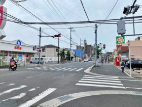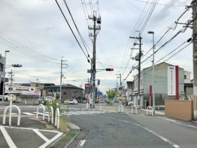 正解は、、、〒578-0948 大阪府東大阪市菱屋東1-2付近を北に向かって撮影しました。写真右手後ろには、東大阪花園郵便局があります…