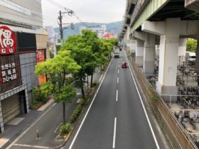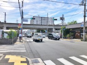 正解は、、、〒577-0054 大阪府東大阪市高井田元町1-18付近。長栄寺東の交差点を西に向かって撮影しました。南北に走る高架はJR…