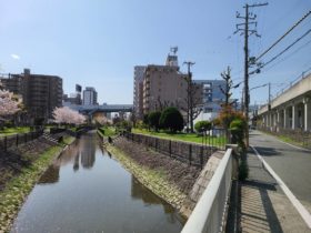 正解は、、、〒577-0063 大阪府東大阪市川俣1-2付近を南に向かって撮影しました。長瀬川沿いには長瀬川遊歩公園が。写真右手にはJR…