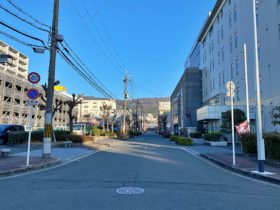 正解は、、、〒579-8013 大阪府東大阪市西石切町7付近、中央大通りの北側。被服団地を松田被服株式会社を右手に、東に向かって撮影し…