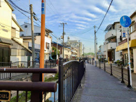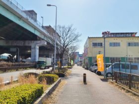 正解は、、、〒577-0827 大阪府東大阪市衣摺1付近、「野村文具店」を右手に長瀬川沿いを南東に向かって撮影しました。写真右…
