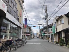 正解は、、、〒577-0809 大阪府東大阪市永和2-19付近。銭湯・永和湯の前から東に向かって撮影。右奥にいつも混んでる福井…