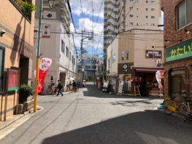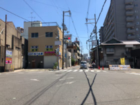 正解は、、、〒577-0802 大阪府東大阪市小阪本町1-2付近。近鉄河内小阪駅南、三井住友銀行小阪支店を左に見て撮影。突き当り…