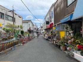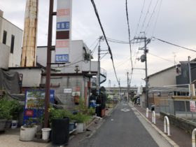 正解は、、、〒578-0924 大阪府東大阪市吉田5-7-6。銭湯・花園温泉の前を南に向かって撮影。向こうに見える高架は近鉄…