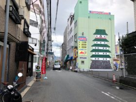 正解は、、、〒577-0801 大阪府東大阪市小阪2-14付近。近鉄八戸ノ里駅北西、ハッピーホーム八戸ノ里ビルの新小阪城が描…