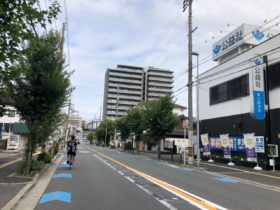 〒577-0057 東大阪市足代新町11付近。右手に見えるのは「かき小屋鳥羽水産東大阪店」。商店街に向かって西に…